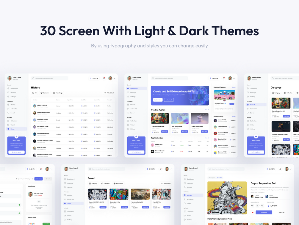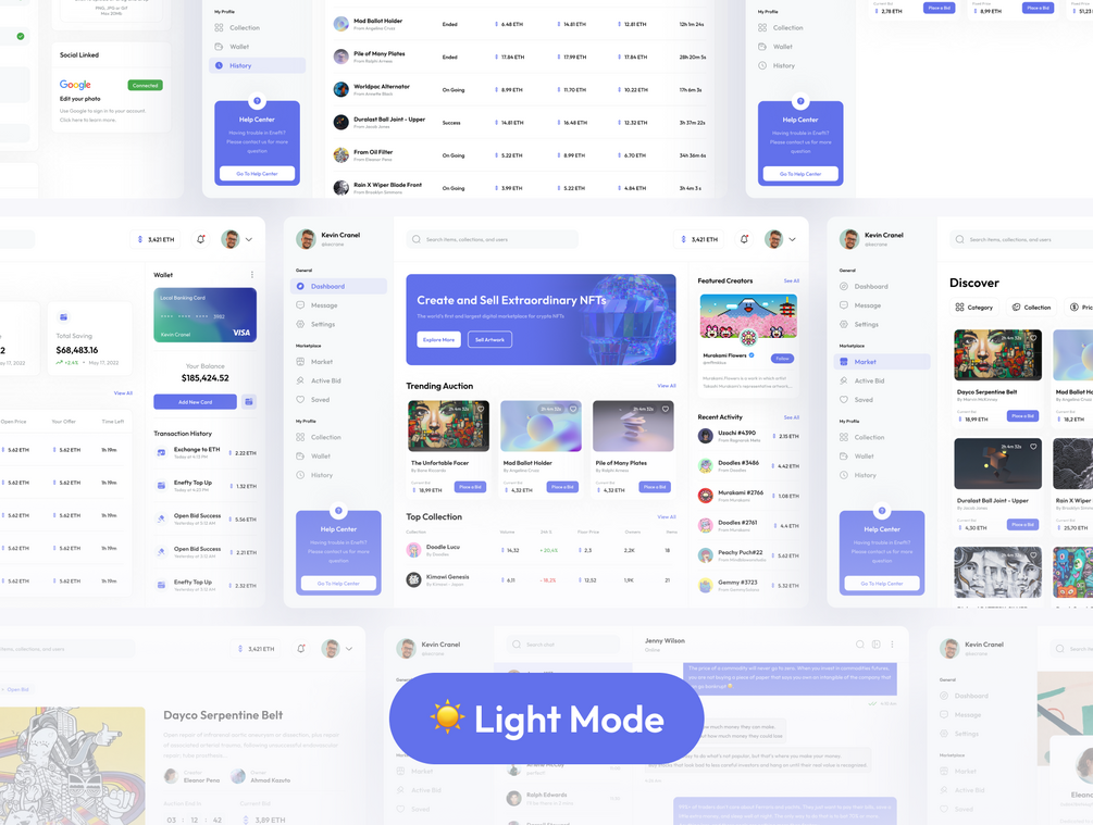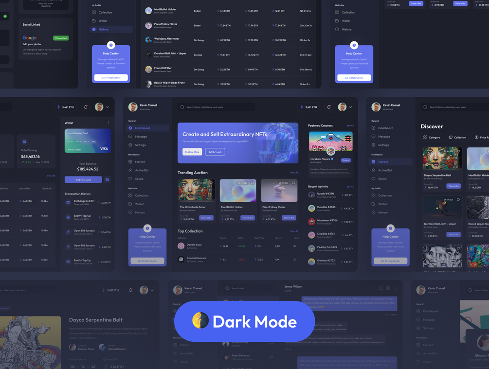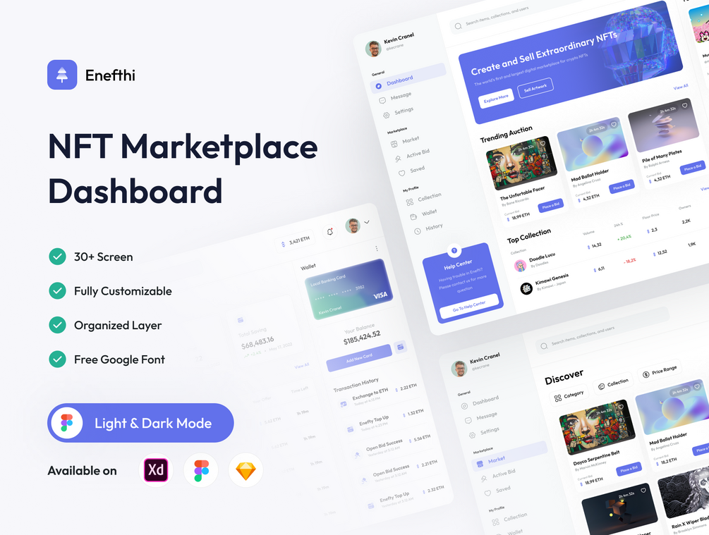 Enefthi is an NFT Marketplace Dashboard UI Kit with 30++ high-quality screens and is easy to use with clean, neat, and modern design. Available Light & Dark theme in Adobe XD,Figma,Sketch file.