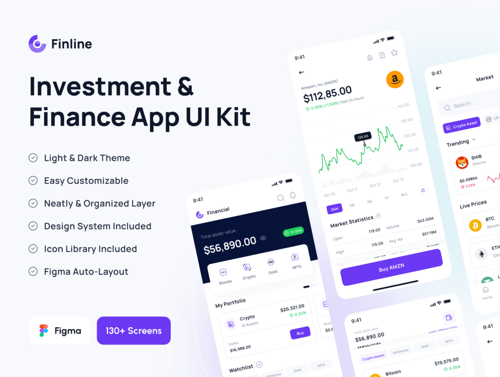 Finline is All In One Investments & Finance App UI Kit with detailed high-quality screens and easy to use in Figma. We designed 130+ Light Theme & 130+ Dark Theme mobile app design screens.